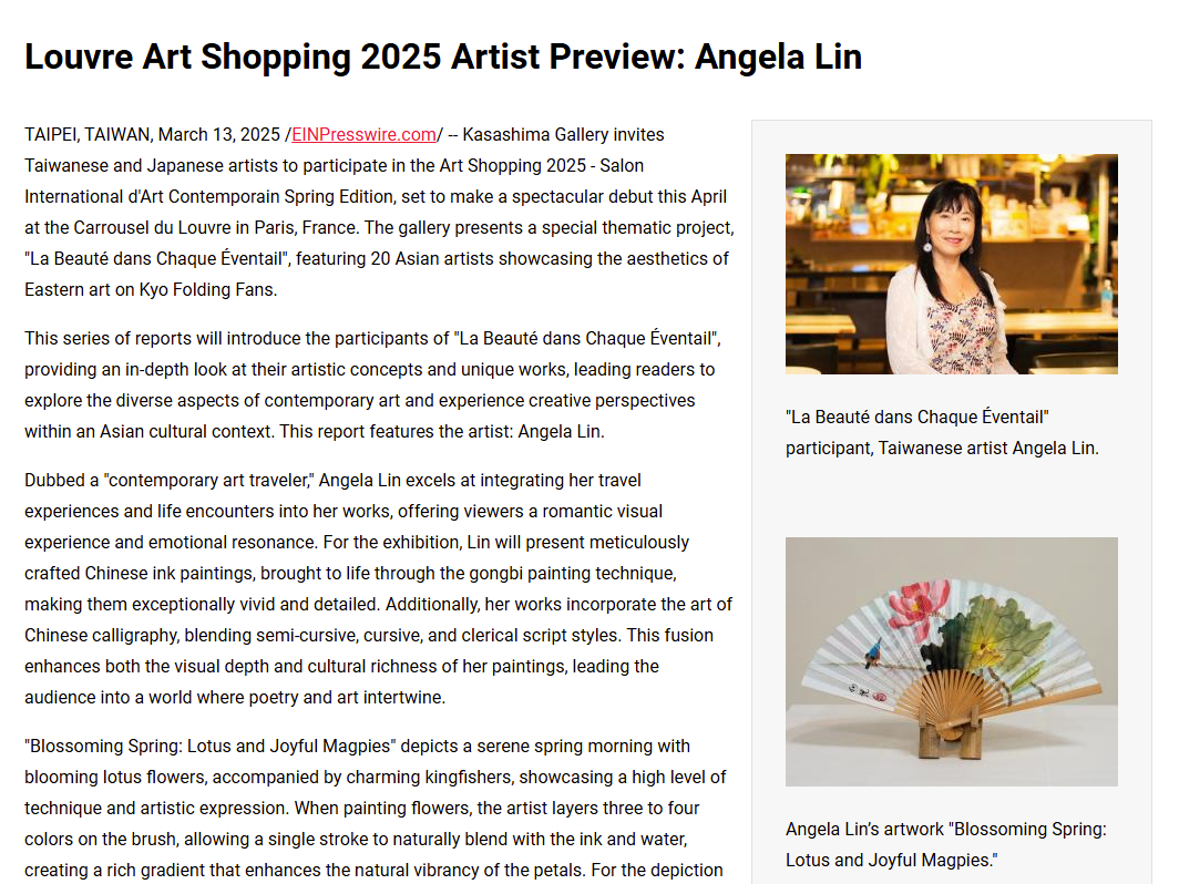 (2025年3月13日 / Switzerland Weekly) Kasashima Gallery invites Taiwanese and Japanese artists to participate in the Art Shopping 2025 – Salon International d’Art Contemporain Spring Edition, set to make a spectacular debut this April at the Carrousel du Louvre in Paris, France. The gallery presents a special thematic project, “La Beauté dans Chaque Éventail”, featuring 20 Asian artists showcasing the aesthetics of Eastern art on Kyo Folding Fans.