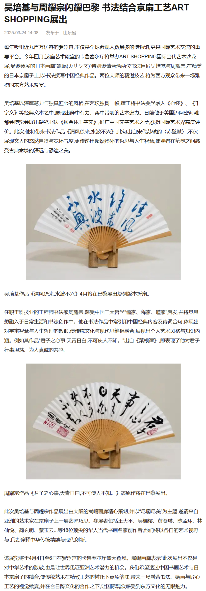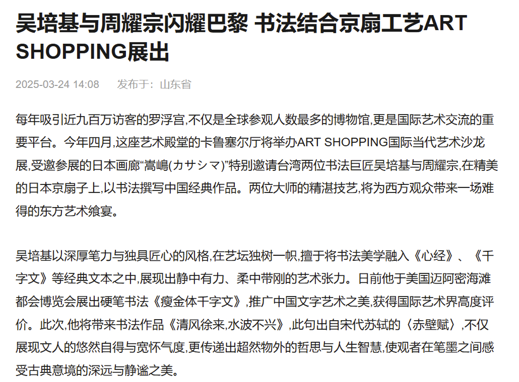(2025年3月24日 / 搜狐新闻) 每年吸引近九百万访客的罗浮宫,不仅是全球参观人数最多的博物馆,更是国际艺术交流的重要平台。今年四月,这座艺术殿堂的卡鲁塞尔厅将举办ART SHOPPING国际当代艺术沙龙展,受邀参展的日本画廊“嵩嶋(カサシマ)”特别邀请台湾两位书法巨匠吴培基与周耀宗,在精美的日本京扇子上,以书法撰写中国经典作品。两位大师的精湛技艺,将为西方观众带来一场难得的东方艺术飨宴。