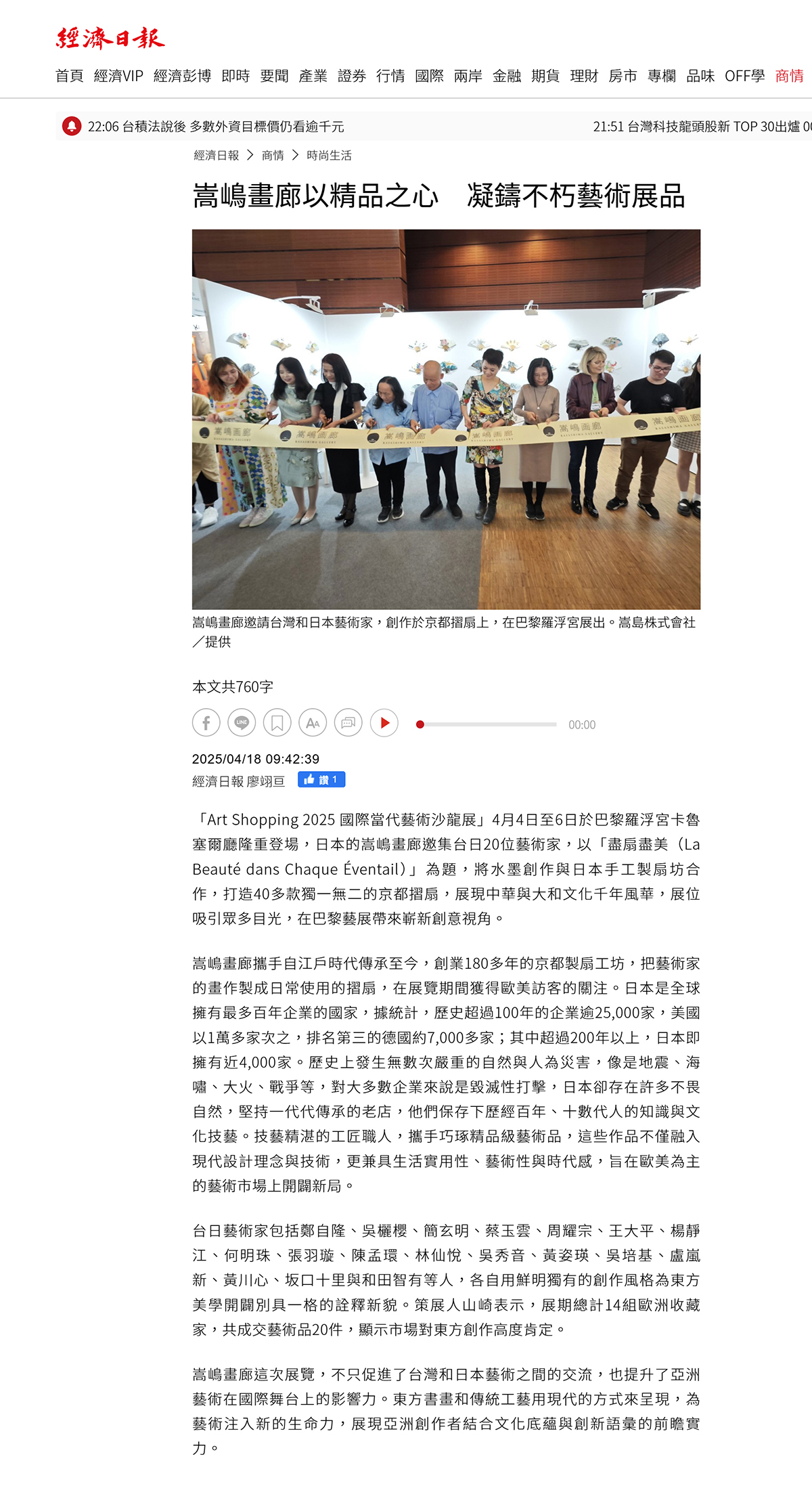 (2025年4月18日 / 經濟日報) 「Art Shopping 2025 國際當代藝術沙龍展」4月4日至6日於巴黎羅浮宮卡魯塞爾廳隆重登場,日本的嵩嶋畫廊邀集台日20位藝術家,以「盡扇盡美(La Beauté dans Chaque Éventail)」為題,將水墨創作與日本手工製扇坊合作,打造40多款獨一無二的京都摺扇,展現中華與大和文化千年風華,展位吸引眾多目光,在巴黎藝展帶來嶄新創意視角。