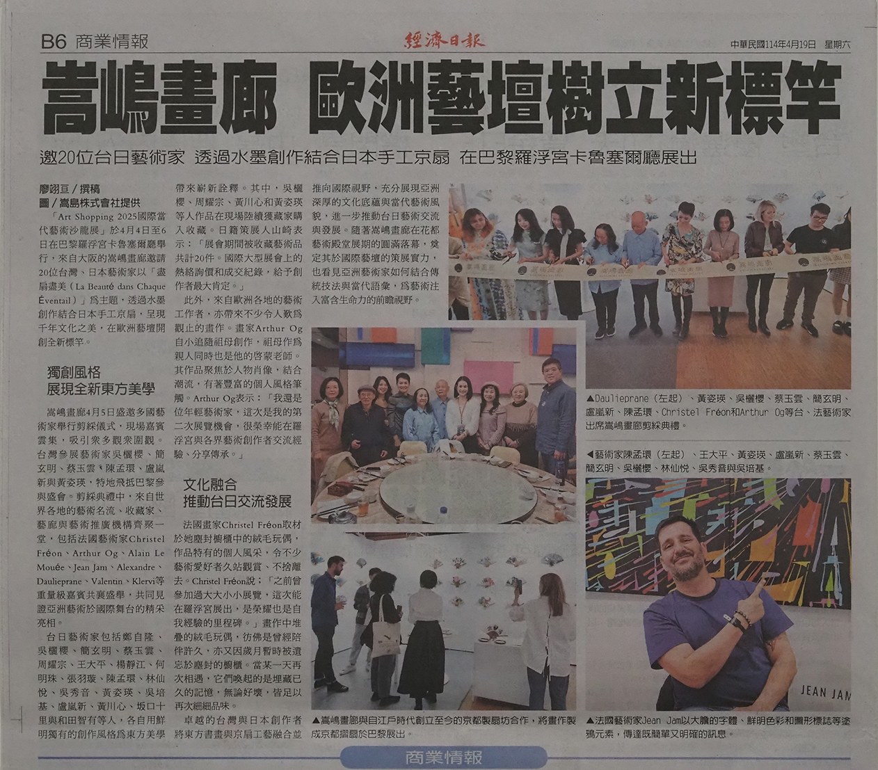 (2025年4月19日 / 經濟日報) 「Art Shopping 2025 國際當代藝術沙龍展」於4月4日至6日在巴黎羅浮宮卡魯塞爾廳舉行,來自大阪的嵩嶋畫廊邀請20位台灣、日本藝術家以「盡扇盡美(La Beauté dans Chaque Éventail)」為主題,透過水墨創作結合日本手工京扇,呈現千年文化之美,在歐洲藝壇開創全新標竿。